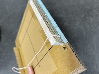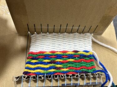 試行錯誤の末に作られたのが、画像のようなお手製ダンボール機織り機です。