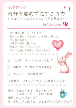 そんな方が多いなと思い、心理学Café「セルフ・コンパッション」を開催することとなりました。
