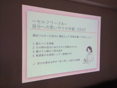 今回は「セルフ・コンパッション」のセルフワークを通して、自分を大切にしていく力をつけていくのがねらいです。